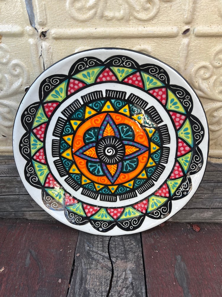 Slab built using a low fire clay and painted with velvet underglazes. Fully functional including dishwasher safe!