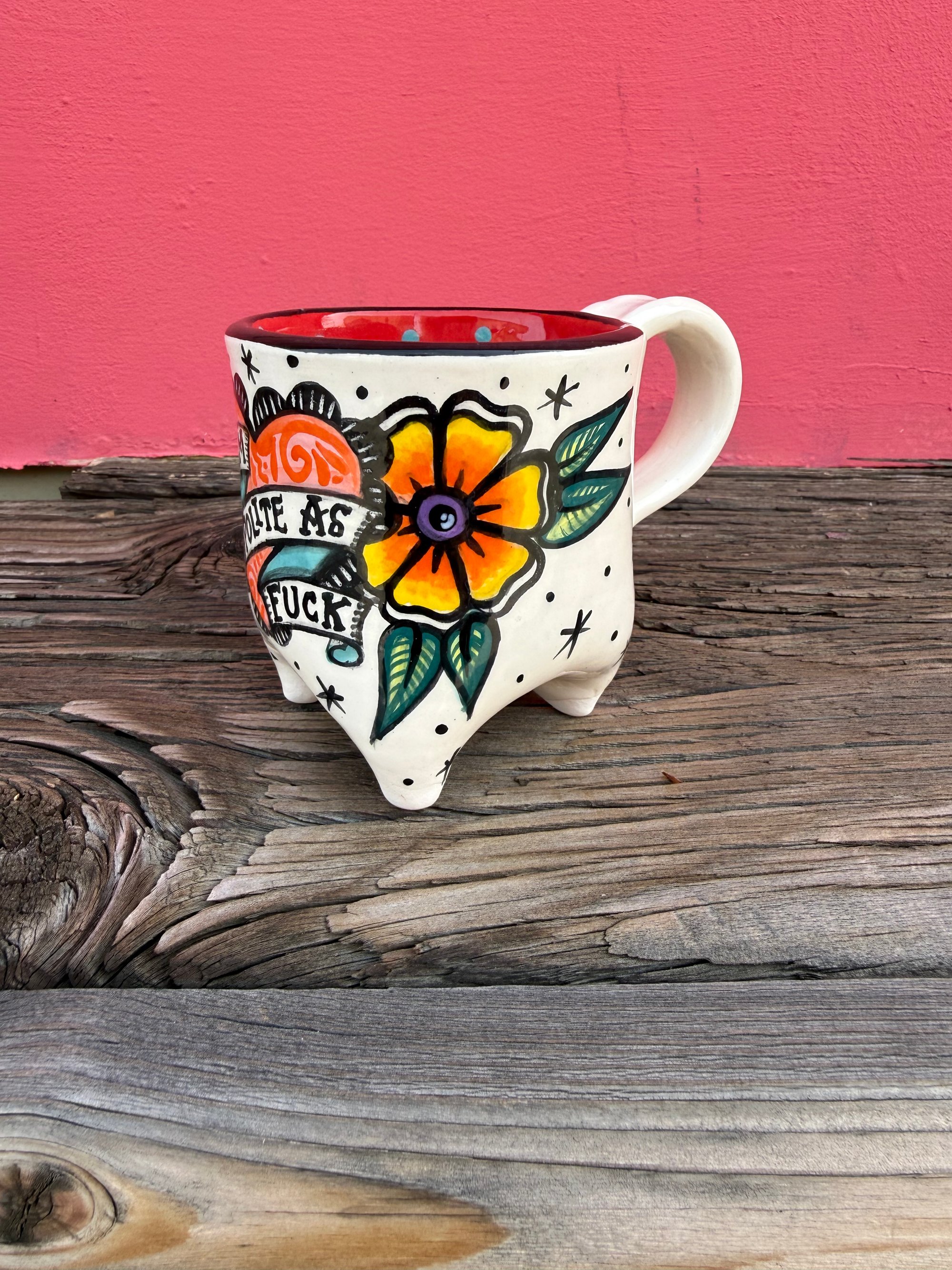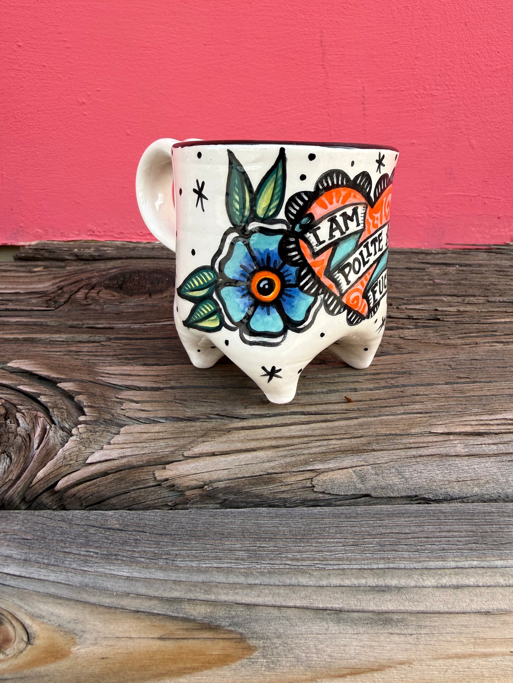 A lovely message to those who would think otherwise. Hand built using low fire clay and velvet underglazes. Holds approximately 10 oz and is dishwasher, microwave and food safe.