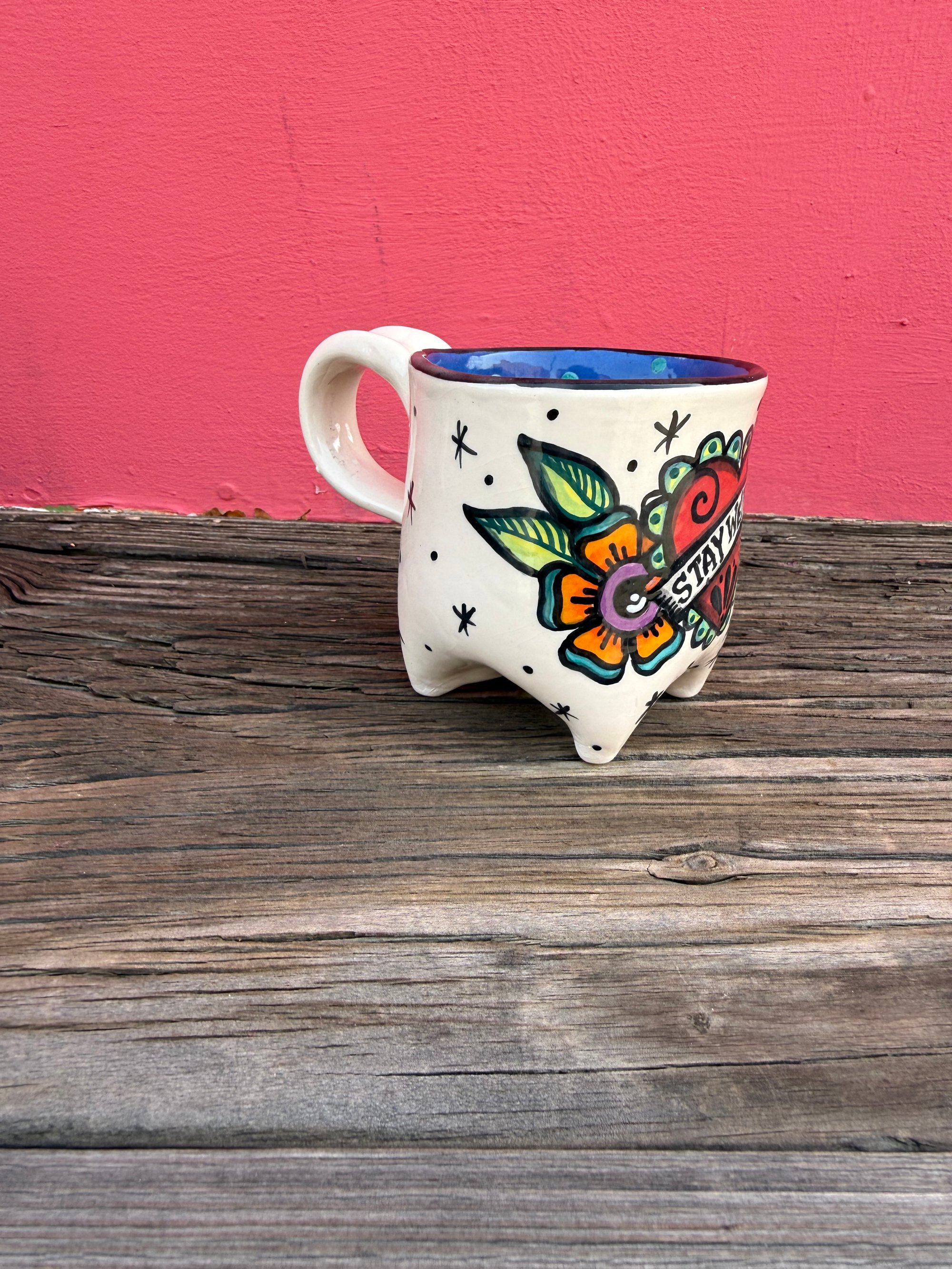 Hand built using a low fire clay and velvet underglazes.