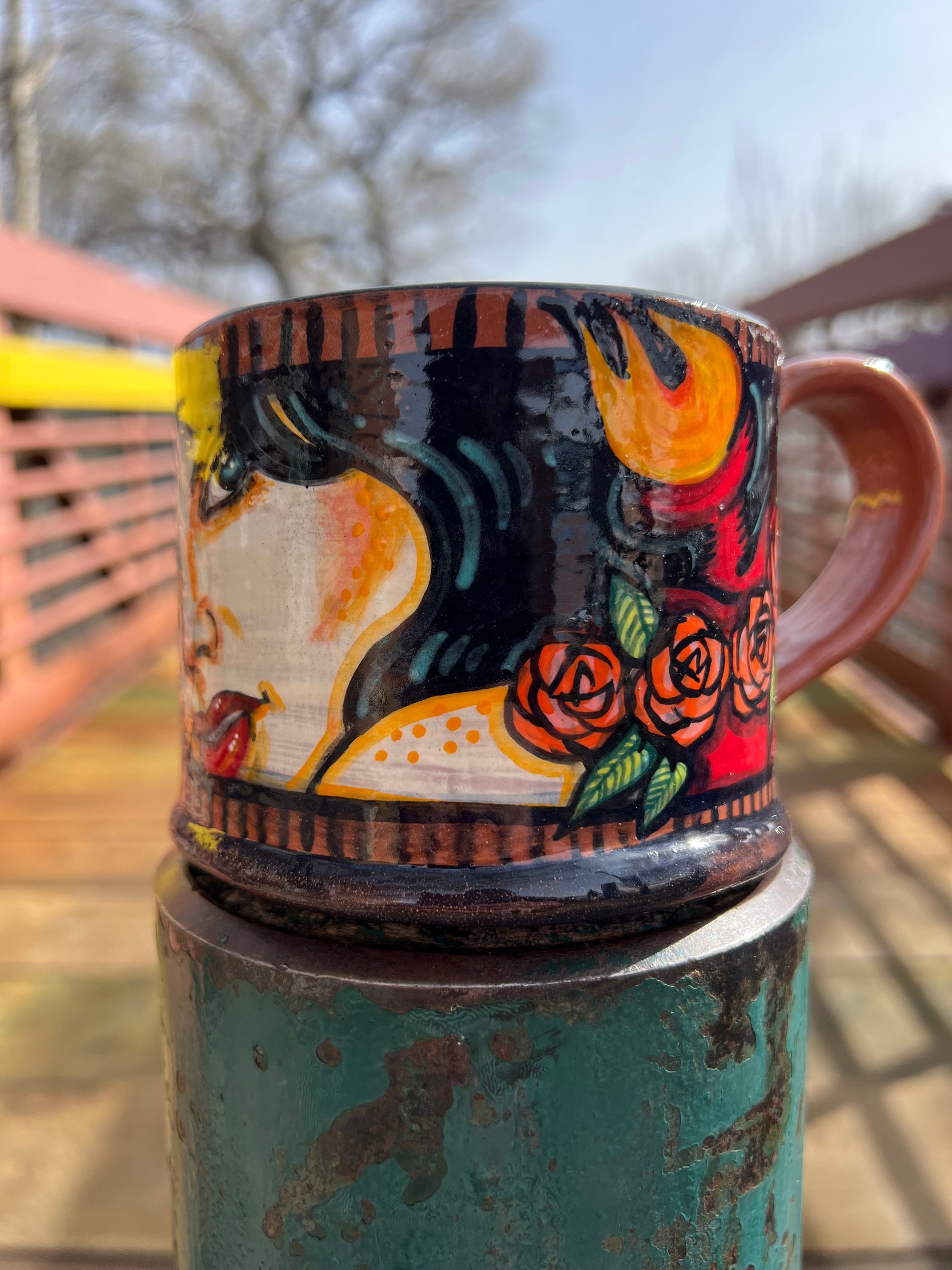 Hand built using a low fire red clay and velvet underglazes. Food safe, microwave safe and dishwasher safe. Holds approximately 16-18oz.