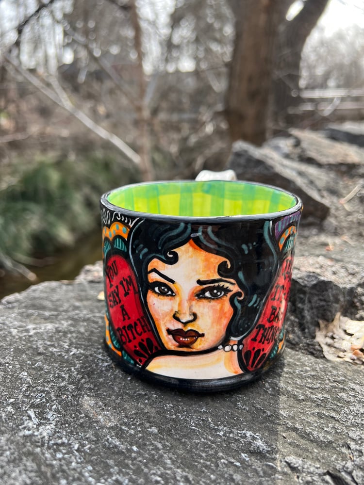 Hand built using low fire clay and velvet underglazes. Safe for daily use as well as microwave and dishwasher. Holds approximately 16-18 oz.